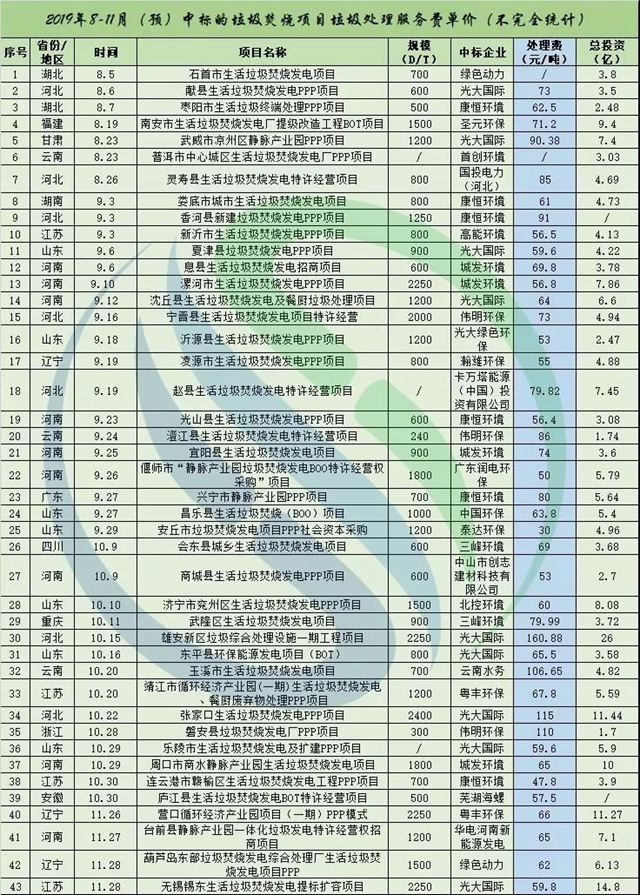 近幾個(gè)月,垃圾焚燒項(xiàng)目接連放出中標(biāo)結(jié)果,其中不少項(xiàng)目的垃圾處理服務(wù)費(fèi)價(jià)格喜人,引來業(yè)內(nèi)廣泛關(guān)注。 10月15日,河北省雄安新區(qū)垃圾綜合處理設(shè)施一期工程項(xiàng)目發(fā)布中標(biāo)公告,光大國際有限公司成為中標(biāo)的社會(huì)資本方,中標(biāo)金額160.88元/噸; 10月20日,云南省玉溪市生活垃圾焚燒發(fā)電項(xiàng)目發(fā)布中標(biāo)公告,云南...