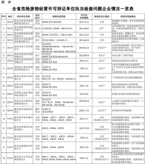 為嚴(yán)厲打擊非法轉(zhuǎn)移傾倒違法犯罪行為,堅(jiān)決遏制危險(xiǎn)廢物非法轉(zhuǎn)移高發(fā)態(tài)勢(shì),加強(qiáng)危險(xiǎn)廢物全過(guò)程監(jiān)管,有效防控環(huán)境風(fēng)險(xiǎn),5月27日至6月4日,省環(huán)保廳成立執(zhí)法檢查組,對(duì)全省持證單位進(jìn)行綜合執(zhí)法檢查。執(zhí)法檢查分4組對(duì)全省危險(xiǎn)廢物綜合經(jīng)營(yíng)單位85家、廢礦物油收集貯存單位31家共計(jì)116家危險(xiǎn)廢物經(jīng)營(yíng)許可持證單位...