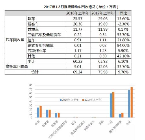 2017年上半年行業(yè)發(fā)展情況2017年上半年,我國回收拆解量較上年度同期有所上升。今年1-6月份,全國回收報廢機動車共計75.98萬輛,與2016年上半年的69.24萬輛相比,同比增長9.7%。數(shù)據(jù)來源:中國物資再生協(xié)會其中,回收報廢汽車63.92萬輛,同比增長6.1%;回收報廢摩托車12.06萬輛...