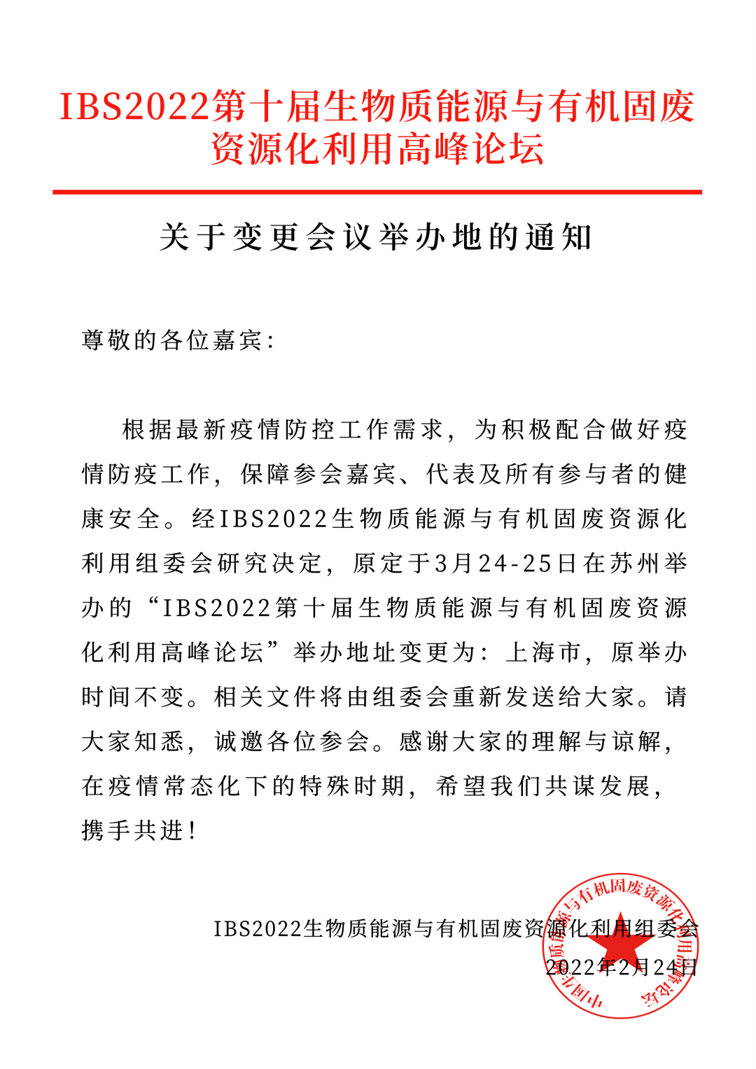 2月24日,IBS2022組委會發(fā)布通知,原定于3月24-25日在蘇州舉辦的“IBS2022第十屆生物質(zhì)能源與有機固廢資源化利用高峰論壇”舉辦地址變更為上海市,時間不變。 3月14日,IBS2022組委會再次發(fā)布通知,原定于2022年3月24-25日在上海舉辦的“...