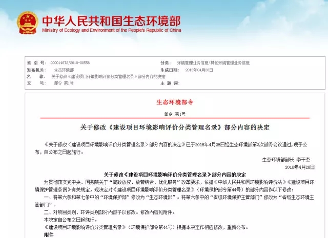 生態(tài)環(huán)境部2018年第3次部務(wù)會審議并通過了《關(guān)于修改<建設(shè)項目環(huán)境影響評價分類管理名錄>部分內(nèi)容的決定》,對《建設(shè)項目環(huán)境影響評價分類管理名錄》(環(huán)境保護(hù)部令第44號)的部分內(nèi)容予以修改,并于公布之日起實施。來源:生態(tài)環(huán)境部修改《建設(shè)項目環(huán)境影響評價分類管理名錄》,是落實習(xí)近平總書記重...
