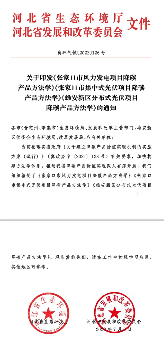 近日,由張家口市生態(tài)環(huán)境局組織編制的《張家口市風(fēng)力發(fā)電項(xiàng)目降碳產(chǎn)品方法學(xué)》和《張家口市集中式光伏項(xiàng)目降碳產(chǎn)品方法學(xué)》,獲河北省生態(tài)環(huán)境廳、河北省發(fā)展改革委聯(lián)合批準(zhǔn)發(fā)布實(shí)施,是2022年河北省首批發(fā)布的降碳產(chǎn)品方法學(xué),也是全國首個市級“綠電”降碳產(chǎn)品方法學(xué)。 今年以來,張家口市...