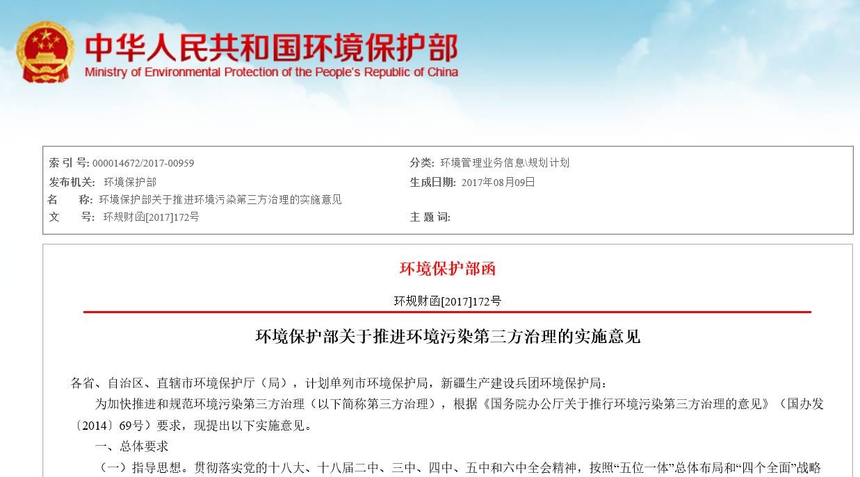 文章導(dǎo)讀 為加快推進(jìn)和規(guī)范環(huán)境污染第三方治理,環(huán)保部發(fā)布《環(huán)境保護(hù)部關(guān)于推進(jìn)環(huán)境污染第三方治理的實(shí)施意見》。文件中,細(xì)化環(huán)境污染第三方治理。劃定第三方責(zé)任,指出第三方治理單位應(yīng)建立臺(tái)賬記錄,將構(gòu)建第三方治理信息平臺(tái)。企業(yè)污染排放超標(biāo)超總量的,將實(shí)施第三方限期治理。并提出引入第三方支付機(jī)制,依環(huán)境績效...