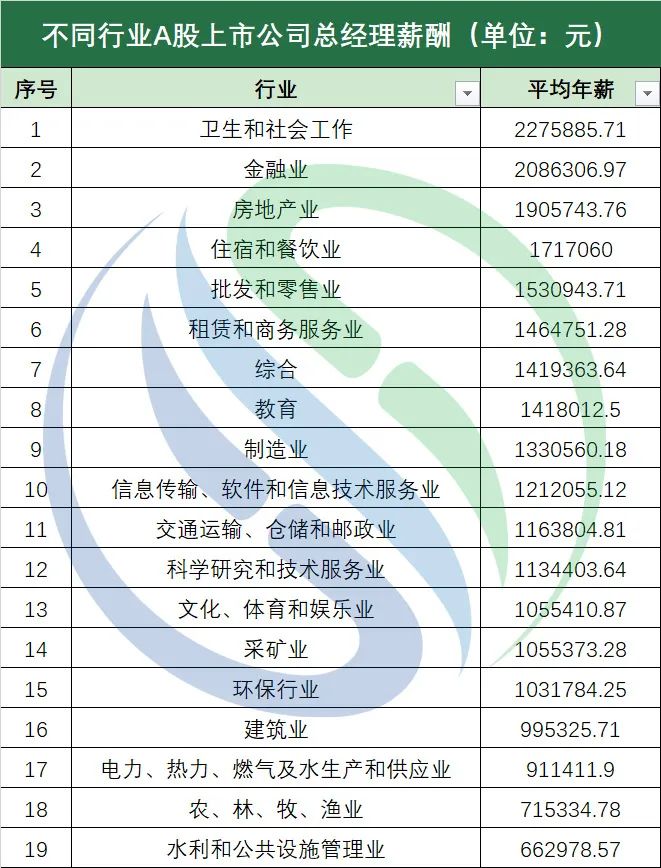 2021年約有4800家A股上市公司發(fā)布年報,但由于總經(jīng)理由董事長兼任等情況,萬得資訊(wind)僅收錄了2907份總經(jīng)理年薪數(shù)據(jù)。中國水網(wǎng)將其中的126家環(huán)保類公司總經(jīng)理年薪數(shù)據(jù)剝離出來,并參考證監(jiān)會的行業(yè)分類,將剩余的企業(yè)分為了金融業(yè)、房地產(chǎn)業(yè)、制造業(yè)等18個行業(yè),加上環(huán)保行業(yè),共計19個行業(yè),...