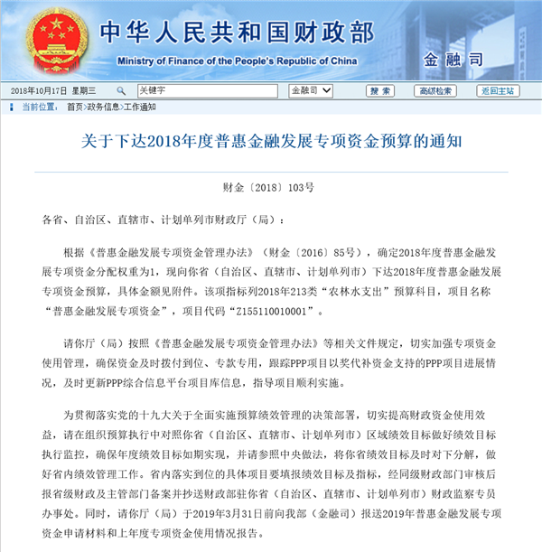 近日,根據《普惠金融發(fā)展專項資金管理辦法》(財金〔2016〕85號),確定2018年度普惠金融發(fā)展專項資金分配權重為1,向各省、自治區(qū)、直轄市、計劃單列市財政廳(局)下達2018年度普惠金融發(fā)展專項資金預算的通知,隨文公布了獲得以獎代補資金項目名單,并在財政部網站上予以公布。與陜西省環(huán)保集團合作的陜...
