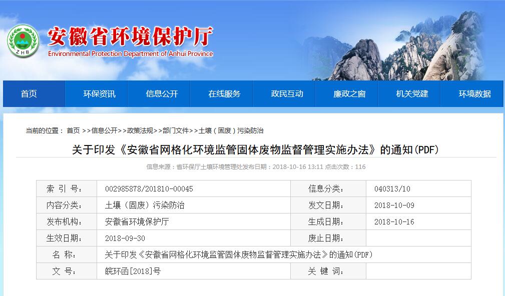 日前,環(huán)保廳公布《安徽省網(wǎng)格化環(huán)境監(jiān)管監(jiān)督管理實施辦法》,詳情如下:各市、省直管縣環(huán)保局、住房城鄉(xiāng)建設(shè)委、城管局、國土資源局、農(nóng)委、水利局、林業(yè)局、安全監(jiān)管局:根據(jù)《安徽省人民政府關(guān)于建立固體廢物污染防控長效機制的意見》(皖政〔2018〕51號)要求,制定了《安徽省網(wǎng)格化環(huán)境監(jiān)管實施辦法》,現(xiàn)印發(fā)給...