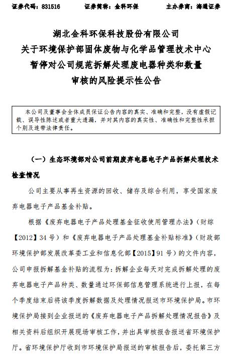 10月17日,發(fā)布公告稱,公司主營業(yè)務(wù)業(yè)務(wù)因未通過2018 年第二批次拆解處理技術(shù)復(fù)核,已暫停工作,該業(yè)務(wù)營收約占公司主營業(yè)務(wù)營收的70%,預(yù)計將對金科環(huán)保的經(jīng)營情況產(chǎn)生較大的不利影響。公告顯示,金科環(huán)保廢舊電器拆解業(yè)務(wù)未通過審核的原因在于:1、存在集中大規(guī)模拆解疑似拼裝、仿制液晶類廢電器并申領(lǐng)基金...