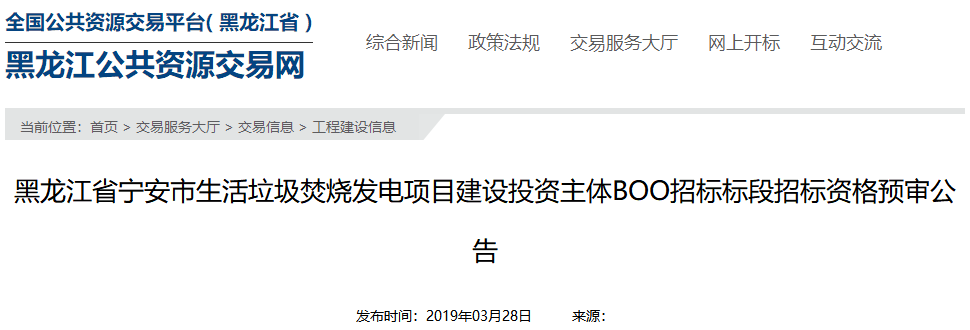 中國環(huán)聯(lián)網(wǎng)獲悉,3月28日,黑龍江省寧安市生活垃圾焚燒發(fā)電項(xiàng)目建設(shè)投資主體BOO招標(biāo)發(fā)布資格預(yù)審公告。項(xiàng)目概況與招標(biāo)范圍項(xiàng)目名稱:黑龍江省寧安市生活垃圾焚燒發(fā)電項(xiàng)目建設(shè)投資主體BOO招標(biāo)建設(shè)方式:采用BOO特許經(jīng)營方式建設(shè),中標(biāo)人須按《中華人民共和國公司法》和相關(guān)企業(yè)法等國家有關(guān)法律、法規(guī)以及政策規(guī)...