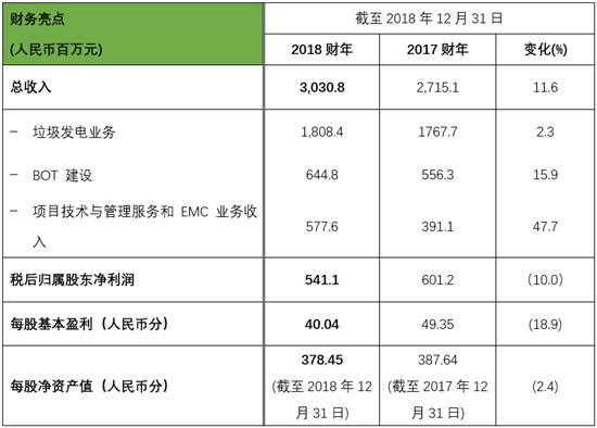 集團(tuán)各業(yè)務(wù)版塊收入增加,2018財(cái)年集團(tuán)總收入達(dá)到人民幣30.3億元。稅后歸屬股東凈利潤(rùn)為人民幣5.4億元。在2018年12月31日和2017年12月31日,總發(fā)行股數(shù)為1,443,246,800和1,221,581,000。(新加坡,2019年3月3日) - 中國(guó)領(lǐng)先的垃圾焚燒發(fā)電(“WTE”)運(yùn)...