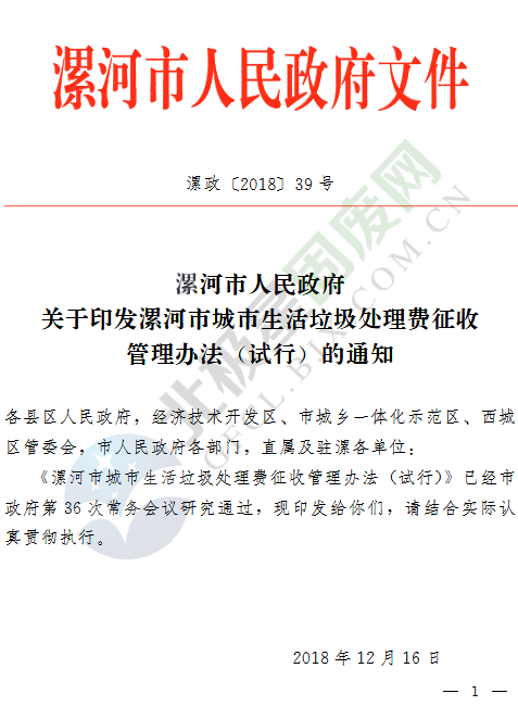 日前,《漯河市城市生活垃圾處理費(fèi)征收管理辦法(試行)》已經(jīng)河南漯河市政府第36次常務(wù)會議研究通過,并于2019年1月1日起試行?!朵鸷邮谐鞘猩罾幚碣M(fèi)征收管理辦法(試行)》是對《漯河市城市生活垃圾處理費(fèi)計(jì)收管理暫行辦法》(漯政〔2005〕73號)的完善修訂。具體內(nèi)容如下:漯河市城市生活垃圾處理費(fèi)...
