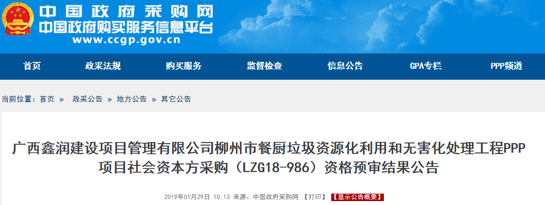 廣西鑫潤建設項目管理有限公司受柳州市市容管理局 委托,根據(jù)《中華人民共和國政府采購法》等有關規(guī)定,現(xiàn)對廣西鑫潤建設項目管理有限公司柳州市餐廚垃圾資源化利用和無害化處理工程PPP項目社會資本方采購(LZG18-986)資格預審公告進行其他招標,歡迎合格的供應商前來投標。項目名稱:廣西鑫潤建設項目管理有...