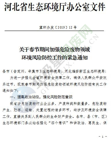 近日,河北省生態(tài)環(huán)境廳發(fā)布了關于春節(jié)期間加強危險廢物領域環(huán)境風險防控工作的緊急通知,要求加大涉危險廢物領域重點行業(yè)企業(yè)的環(huán)境監(jiān)管力度,2月份,全省暫停實施跨界危險廢物轉(zhuǎn)運,特殊情況必須轉(zhuǎn)移的,一事一報。詳情如下: