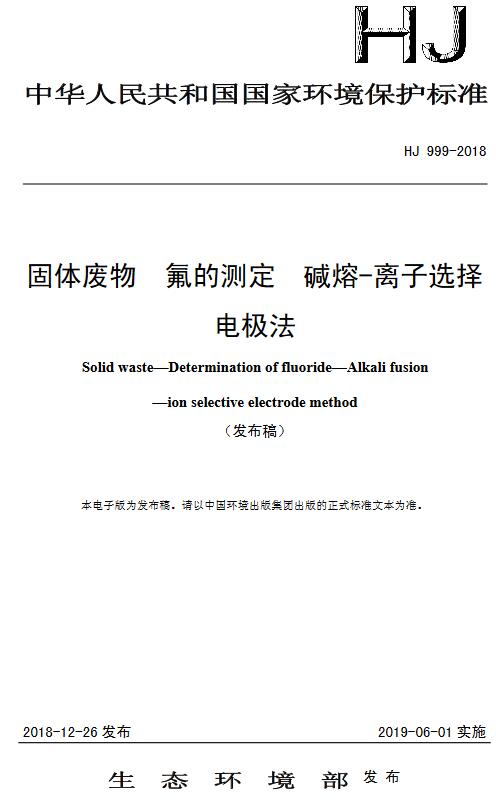 日前生態(tài)環(huán)境部發(fā)布了國(guó)家環(huán)境保護(hù)標(biāo)準(zhǔn):《固體廢物氟的測(cè)定 堿熔-離子選擇電極法》(HJ 999-2018),具體內(nèi)容如下:固體廢物 氟的測(cè)定 堿熔-離子選擇電極法Solid waste—Determination of fluoride—Alkali fusion—ion ive electrode...