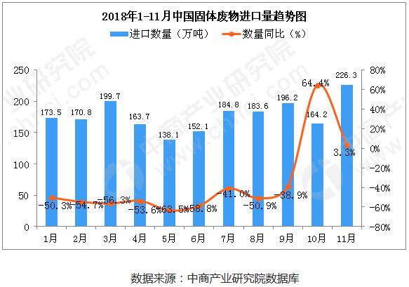 據(jù)中商產(chǎn)業(yè)研究院數(shù)據(jù)庫顯示,2018年11月中國固體廢物進口量大幅度增長,2018年11月中國固體廢物進口量為226.3萬噸,同比增長3.3%。從金額方面來看,2018年8-10月中國固體廢物進口金額呈下降趨勢,2018年11月中國固體廢物進口金額有大幅度回升;2018年11月中國固體廢物進口金額為...