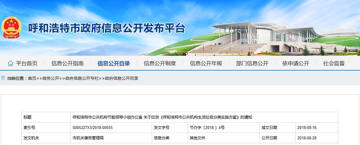呼和浩特市印發(fā)了《呼和浩特市公共機構生活垃圾分類實施方案》,詳情如下:呼和浩特市公共機構節(jié)能領導小組辦公室關于印發(fā)《呼和浩特市公共機構生活垃圾分類實施方案》的通知市各部委辦局,各人民團體、事業(yè)單位:為深入貫徹習近平總書記關于普遍推行垃圾分類制度的重要講話精神,根據(jù)國家、自治區(qū)、市政府關于實施生活垃圾...