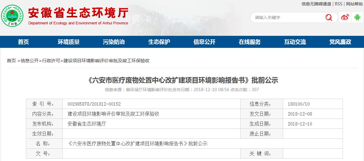 日前,安徽省生態(tài)環(huán)境廳對《六安市醫(yī)療廢物處置中心改擴建項目環(huán)境影響報告書》進行批前公示,詳情如下:根據(jù)建設項目環(huán)境影響評價審批程序的有關規(guī)定,經(jīng)審議,我廳擬對《六安市醫(yī)療廢物處置中心改擴建項目環(huán)境影響報告書》作出審批意見。為保證審批意見的嚴肅性和公正性,現(xiàn)將該項目環(huán)境影響評價文件的基本情況予以公示。...