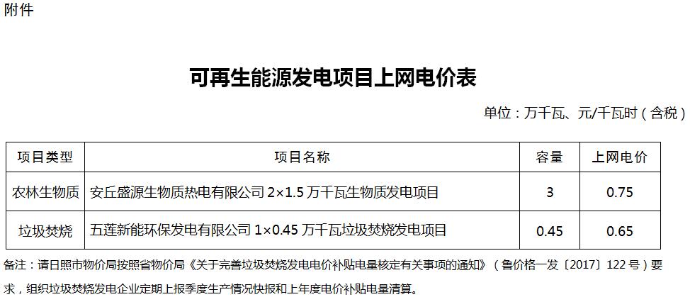 山東省發(fā)展和改革委員會關(guān)于安丘盛源生物質(zhì)熱電有限公司等可再生能源發(fā)電項目上網(wǎng)電價的批復魯發(fā)改價格〔2018〕1294號濰坊、日照市物價局:你們《關(guān)于核定安丘盛源生物質(zhì)熱電有限公司生物質(zhì)發(fā)電項目上網(wǎng)電價的請示》(濰價辦發(fā)〔2018〕44號)、《關(guān)于五蓮新能環(huán)保發(fā)電有限公司上網(wǎng)電價的請示》(日價格發(fā)〔2...