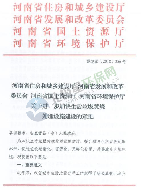 日前,河南省發(fā)布關(guān)于于進一步加快生活垃圾焚燒處理設施建設的意見,到2020年,全省生活垃圾焚燒處理要達到全省生活垃圾量的50%以上。詳情如下: