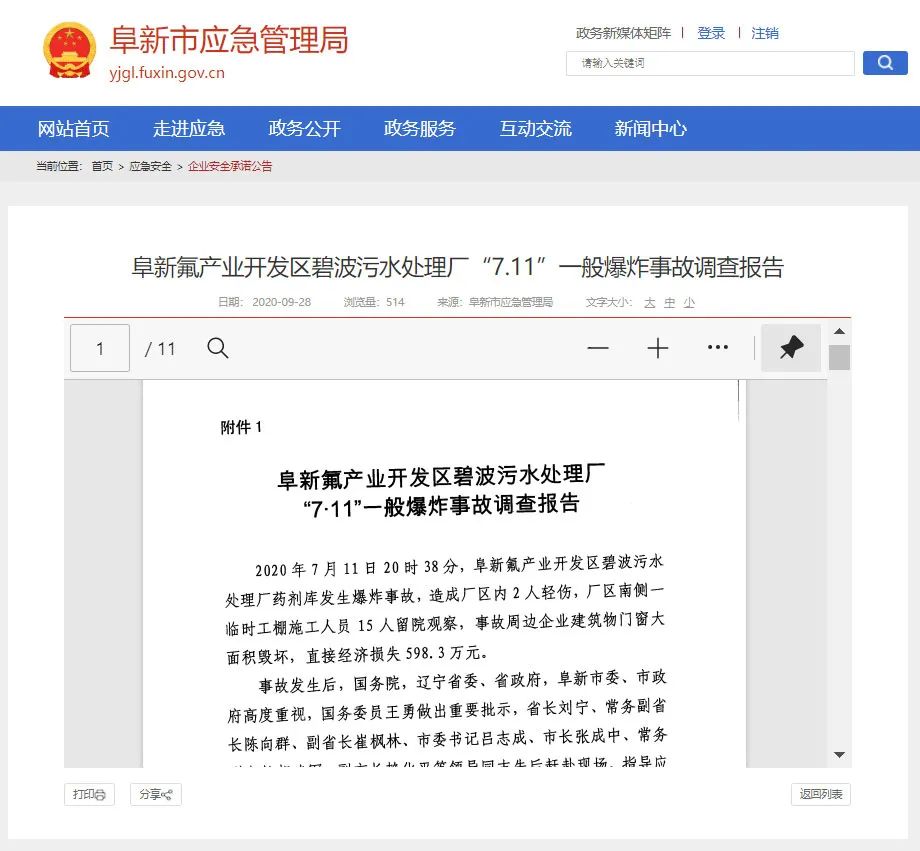 文章導(dǎo)讀近日,阜新市應(yīng)急管理局已經(jīng)發(fā)布了《阜新氟產(chǎn)業(yè)開(kāi)發(fā)區(qū)碧波污水處理廠“7.11”一般爆炸事故調(diào)查報(bào)告》(下稱(chēng)《報(bào)告》)。結(jié)果顯示,爆炸的直接原因是該污水廠違規(guī)使用氯酸鈉催化劑,在儲(chǔ)存時(shí)與赤砂糖發(fā)生化學(xué)反應(yīng)發(fā)生爆炸,爆炸現(xiàn)場(chǎng)形成的沖擊波相當(dāng)1.0-1.5tTNT當(dāng)量。還記得去年7月12日,遼寧省阜...