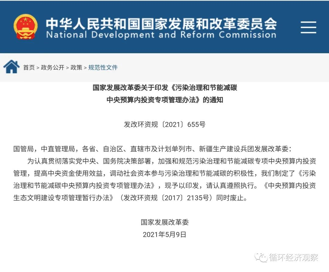 文章導(dǎo)讀5月9日,國家發(fā)改委印發(fā)《污染治理和節(jié)能減碳中央預(yù)算內(nèi)投資專項管理辦法》(以下簡稱“辦法”)的通知,辦法稱,為加強和規(guī)范污染治理和節(jié)能減碳專項中央預(yù)算內(nèi)投資管理,提高中央資金使用效益,調(diào)動社會資本參與污染治理和節(jié)能減碳的積極性,特制定本辦法。此專項將重點支持污水垃圾處理等環(huán)境基礎(chǔ)設(shè)施建設(shè)、節(jié)...