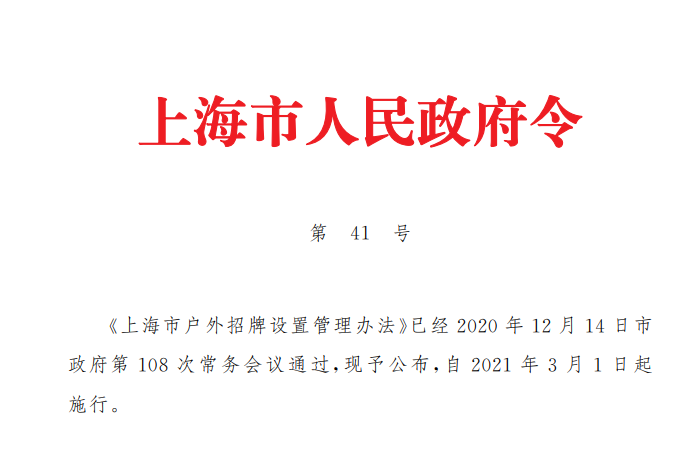 文章導讀戶外招牌是城市公共空間的重要組成部分,直接關系到城市安全和城市形象。安全規(guī)范、賞心美觀的戶外招牌,展現(xiàn)的是上海的文化內(nèi)涵,傳播的是上海的城市文明。《上海市戶外招牌設置管理辦法》(市政府41號令發(fā)布,以下簡稱《辦法》)將于2021年3月1日起施行。希望通過《辦法》,將主體責任、監(jiān)管責任與自治共...