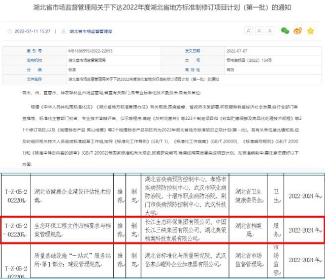 近日,湖北省市場監(jiān)督管理局印發(fā)關(guān)于下達(dá)2022年度湖北省地方標(biāo)準(zhǔn)制修訂項(xiàng)目計(jì)劃(第一批)的通知,長江環(huán)保集團(tuán)牽頭主編的《生態(tài)環(huán)保工程文件歸檔要求與檔案管理規(guī)范》成功入選2022年湖北省地方標(biāo)準(zhǔn)項(xiàng)目立項(xiàng)計(jì)劃(第一批),這是公司成立以來首次牽頭主編的省級地方標(biāo)準(zhǔn)。《湖北省市場監(jiān)督管理局關(guān)于下達(dá)2022年...