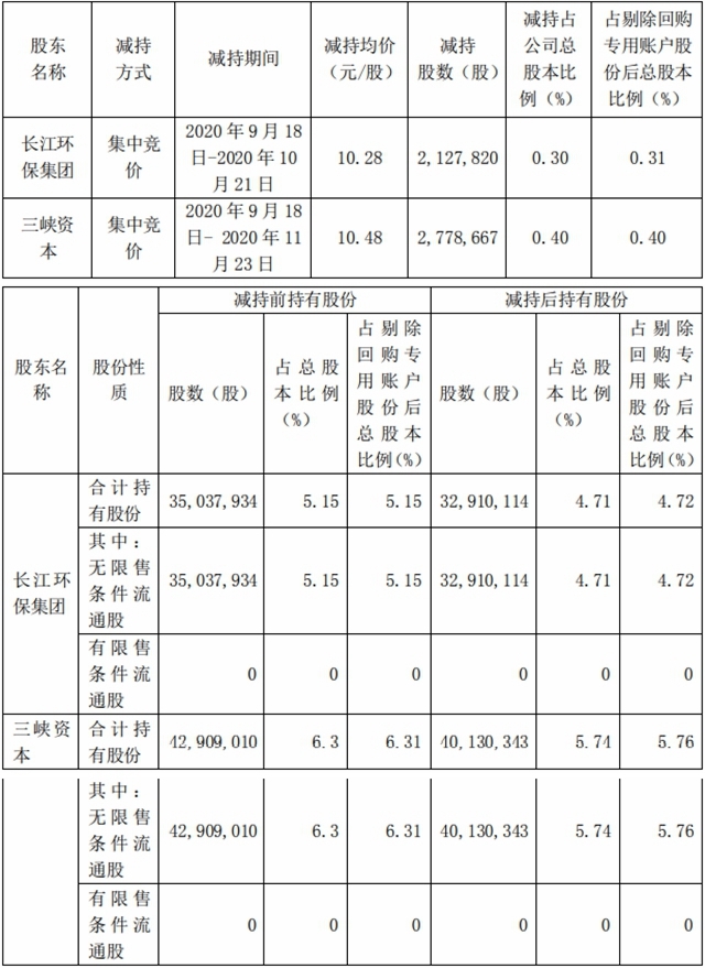 2021年3月19日,中節(jié)能國(guó)禎環(huán)??萍脊煞萦邢薰景l(fā)布《關(guān)于持股 5%以上股東股份減持計(jì)劃期滿暨實(shí)施結(jié)果的公告》。 即長(zhǎng)江生態(tài)環(huán)保集團(tuán)有限公司與其一致行動(dòng)人三峽資本控股有限責(zé)任公司計(jì)劃在6個(gè)月內(nèi)以集中競(jìng)價(jià)交易、大宗交易或換購(gòu)交易型開放式指數(shù)證券投資基金(ETF)方式減持不超過33,975,437股...
