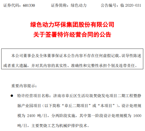 綠色動力環(huán)保6月3日公布一則關(guān)于簽署特許經(jīng)營合同的公告,公告顯示綠色動力與濟(jì)南市章丘區(qū)環(huán)境衛(wèi)生管護(hù)中心簽署《章丘區(qū)生活垃圾焚燒發(fā)電項(xiàng)目二期工程暨靜脈產(chǎn)業(yè)園項(xiàng)目特許經(jīng)營協(xié)議》,項(xiàng)目總投資約15億元(人民幣。下同),第一階段總投資約8.5億元,其中資本金約2.55億元。 綠色動力環(huán)保集團(tuán)指出,該項(xiàng)目采用...