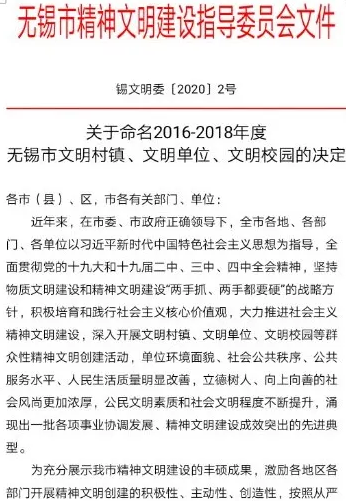 近日,根據(jù)無錫市精神文明建設(shè)指導(dǎo)委員會下發(fā)文件錫文明委〔2020〕2號《關(guān)于命名2016—2018年度無錫市文明村鎮(zhèn)、文明單位、文明校園的決定》,華光股份、市政設(shè)計院、友聯(lián)熱電被授予 2016-2018年度“無錫市文明單位”稱號。 近年來,華光股份在無錫市文明辦等...