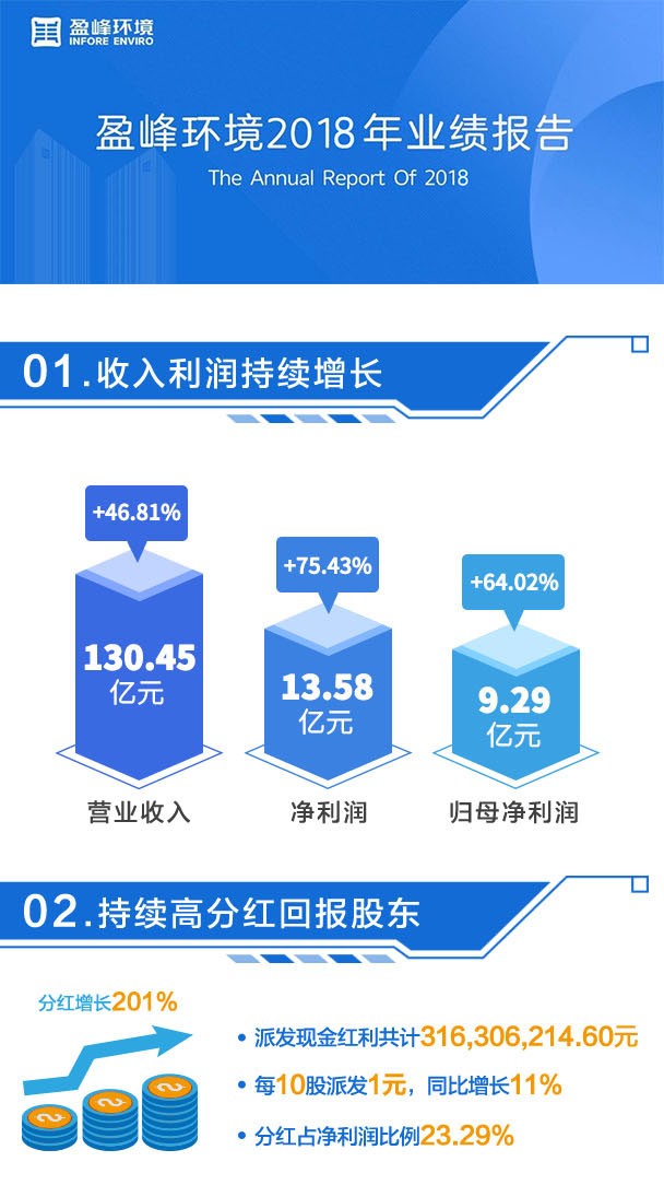 盈峰環(huán)境4月19日最新公布的2018年年報顯示,其營業(yè)收入130億元,同比增長46.81%;歸屬于上市公司股東的凈利潤9.29億元,同比增長64.02%。基本每股收益0.41元。公司最新分配方案為每10股派發(fā)股息人民幣1元,股息率1.32%。具體詳情如下: