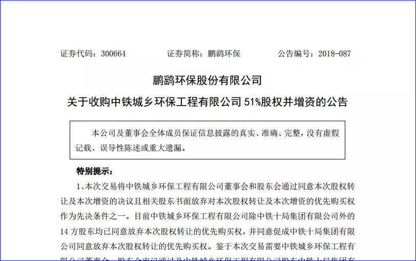 11月19日,鵬鷂環(huán)保股份有限公司開了第二屆董事會第十八次會議,審議通過了《關于收購中鐵城鄉(xiāng)環(huán)保工程有限公司51%股權并增資的議案》,同意公司收購中鐵城鄉(xiāng)環(huán)保工程有限公司(以下簡稱“中鐵環(huán)保”或“標的公司”)51%股權并對其進行增資,其中股權轉讓價款4...