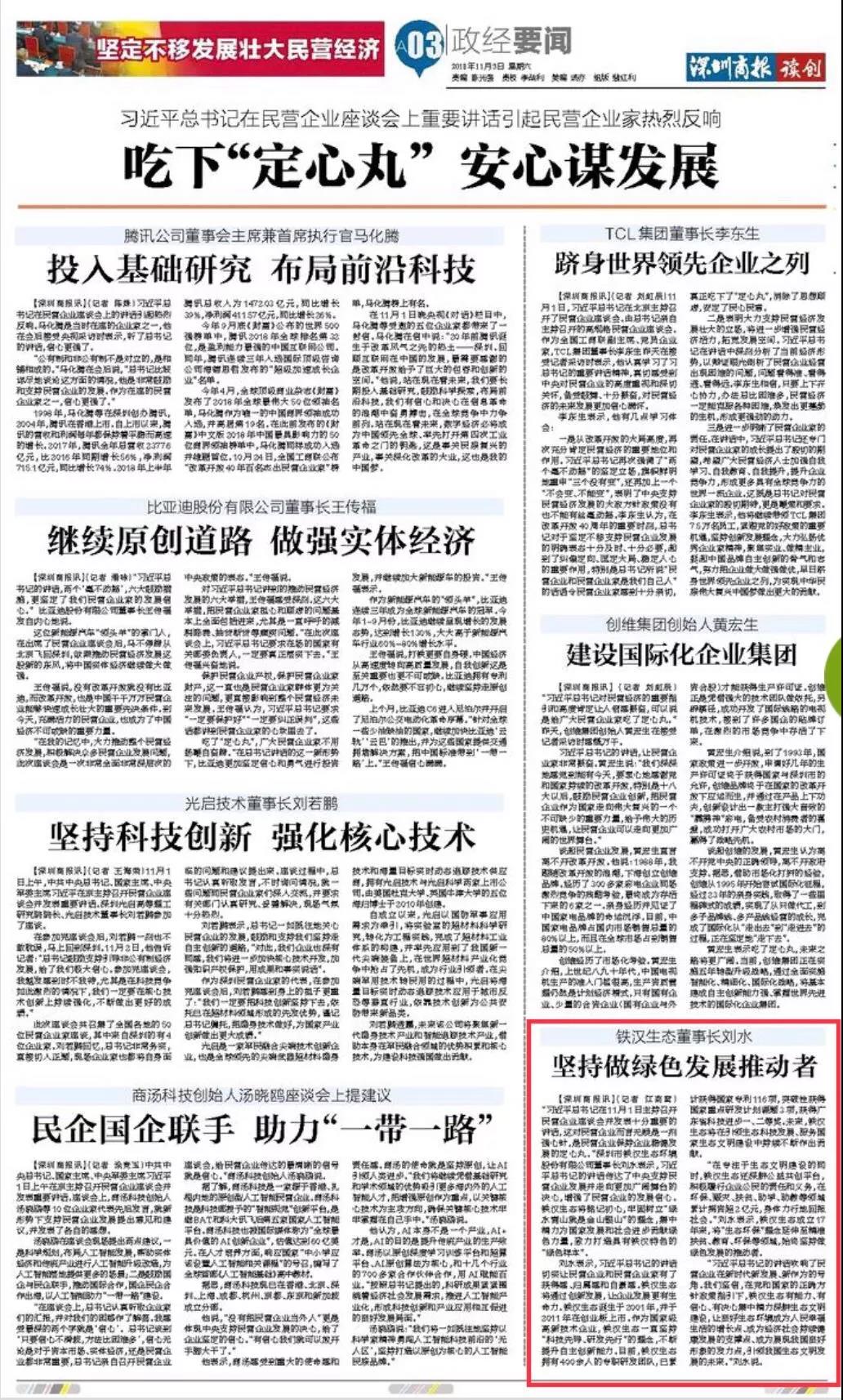 近日,習近平總書記在民營企業(yè)座談會上的重要講話引起民營企業(yè)家熱烈反響,鐵漢生態(tài)作為生態(tài)環(huán)保龍頭民營企業(yè),劉水董事長積極回應。在11月3日《深圳商報》刊登的“堅定不移發(fā)展壯大民營經(jīng)濟”專題報道中,劉水表示,習近平總書記的講話切實讓民營企業(yè)和民營企業(yè)家有了獲得感、歸屬感和自豪感。鐵漢生態(tài)將銘記初心,牢固...