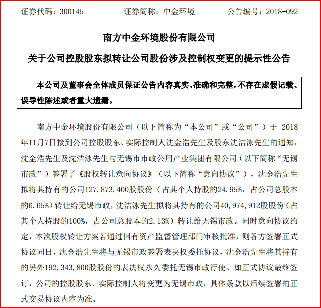 中金環(huán)境公告,公司控股股東、實際控制人沈金浩及股東沈潔泳與無錫市市政公用產(chǎn)業(yè)集團有限公司(以下簡稱“無錫市政”)簽署《股權轉讓意向協(xié)議》。 沈金浩擬將其持有的公司127,873,400股股份(占其個人持股的24.95%,占公司總股本的6.65%)轉讓給無錫市政,沈潔泳擬將其持...