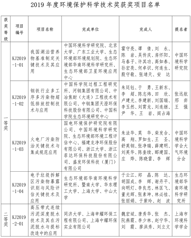 根據(jù)《環(huán)境保護(hù)科學(xué)技術(shù)獎勵辦法》的規(guī)定,經(jīng)有關(guān)專家、單位提名和專家評審,并通過廣泛公示,環(huán)境保護(hù)科學(xué)技術(shù)獎勵委員會批準(zhǔn)39個(gè)項(xiàng)目獲2019年度環(huán)境保護(hù)科學(xué)技術(shù)獎,其中:一等獎4項(xiàng),二等獎33項(xiàng),科普類獎2項(xiàng)。 附:2019年度環(huán)境保護(hù)科學(xué)技術(shù)獎獲獎項(xiàng)目名單 環(huán)境保護(hù)科學(xué)技術(shù)獎勵辦公室 2019年12...