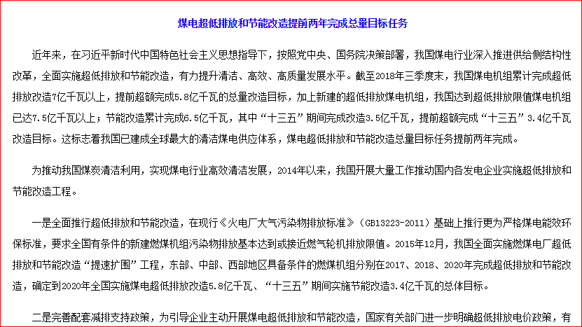 2014年以來,為了推動我國煤炭清潔利用,實現(xiàn)煤電行業(yè)高效清潔發(fā)展,我國開展大量工作推動國內(nèi)各發(fā)電企業(yè)實施超低排放和節(jié)能改造工程,大大提升了煤電行業(yè)清潔、高效、高質(zhì)量的發(fā)展水平。 根據(jù)國家能源局公開的數(shù)據(jù),截至2018年第三季度末,我國煤電機組累計完成超低排放改造7億千瓦以上,提前超額完成5.8億千...