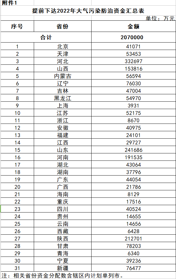 財政部關于提前下達2022年大氣污染防治資金預算的通知 財資環(huán)〔2021〕114號 各省、自治區(qū)、直轄市財政廳(局): 為支持大氣污染防治工作,促進大氣質(zhì)量改善,現(xiàn)下達你省(自治區(qū)、直轄市,以下簡稱省)2022年大氣污染防治資金,用于支持開展減污降碳等方面相關工作,并就有關事項通知如下: 一、各省安...
