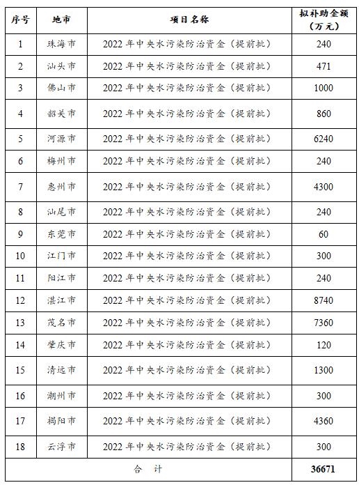 廣東省生態(tài)環(huán)境廳關于2022年中央水污染防治資金(提前批)、大氣污染防治資金(提前批)安排計劃的公示 經(jīng)廳黨組會議、廳務會議審議通過,我廳擬申請?zhí)崆跋逻_2022年中央水污染防治資金36671萬元、大氣污染防治資金44054萬元。 按照《廣東省省級財政專項資金管理辦法(試行)》(粵府〔2018〕120...