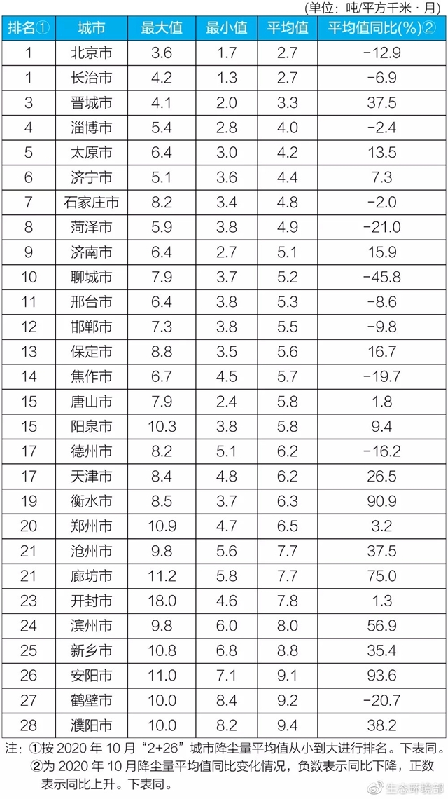 生態(tài)環(huán)境部今日向媒體公布了2020年10月京津冀大氣污染傳輸通道“2+26”城市(以下簡稱“2+26”城市)和汾渭平原11城市降塵監(jiān)測結(jié)果。 “2+26”城市 10月,“2+26”城市降塵量均值范圍在2....