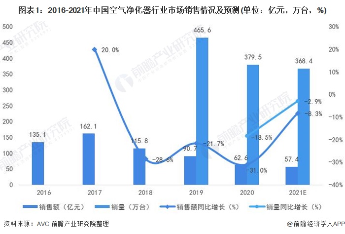 行業(yè)規(guī)模大幅下滑 近年來,中國空氣凈化器行業(yè)的銷售額和銷量均呈現(xiàn)下滑的態(tài)勢。其中2020年中國空氣凈化器銷量為379.5萬臺(tái),同比下降18.5%;銷售額為62.6億元,同比下滑31%。在2020年疫情的影響下,居民對于健康的重視程度不斷提升,將帶動(dòng)空氣凈化器產(chǎn)品的需求增長。 2021年行業(yè)的降幅將有...