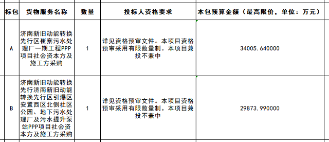 近日,中國政府采購網(wǎng)發(fā)布山東省濟(jì)南市先行區(qū)污水處理廠PPP項(xiàng)目社會(huì)資本方及施工方采購資格預(yù)審公告,采購項(xiàng)目共2個(gè),A標(biāo)包為濟(jì)南新舊動(dòng)能轉(zhuǎn)換先行區(qū)崔寨污水處理廠一期工程PPP項(xiàng)目社會(huì)資本方及施工方采購,預(yù)算金額34005.64萬元,B標(biāo)包為濟(jì)南新舊動(dòng)能轉(zhuǎn)換先行濟(jì)南新舊動(dòng)能轉(zhuǎn)換先行區(qū)引爆區(qū)安置西區(qū)北側(cè)社...