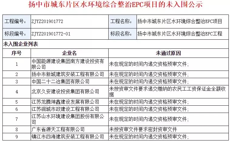 據(jù)悉,近日,揚中市東片區(qū)水環(huán)境綜合整理EPC項目和揚中市城南、城北片區(qū)水環(huán)境綜合整理EPC項目發(fā)布資格預審結果公告。有意思的是,這兩個項目的投資總投資項目不算大,吸引了不少企業(yè),而在資審結果中,不少企業(yè)因未按時遞交資深文件等理由未入圍。 兩個項目未入圍資審的公示如下: 據(jù)悉,揚中市城東片區(qū)水環(huán)境綜合...